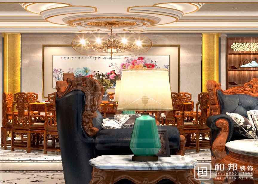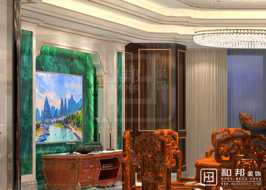 本案從孔雀綠玉石背景墻上彰顯出特意的設(shè)計質(zhì)感,也造就出深淺對比,層次有序的精致風華。