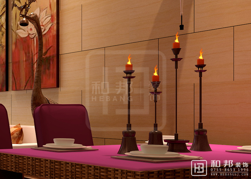 客廳以大氣優雅為主,主要采用天然的木制品制作的工藝品,其中主要體現在客廳中的木制家具和其他裝飾性的工藝品,同時采用色彩鮮艷的粉紫色點綴整體色調。